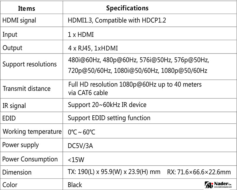 این تقسیم کننده توسعه دهنده HDMI با 4 گیرنده توسعه دهنده HDMI CAT6 برای توزیع و گسترش 1 منبع HDMI به 4 نمایشگر HDMI از طریق یک کابل CAT6/6a/7 تا 40 متر/131 فوت کار می کند. بالاترین رزولوشن پشتیبانی شده 1920x1080@60Hz است و از IR pass back و عبور EDID پشتیبانی می کند.