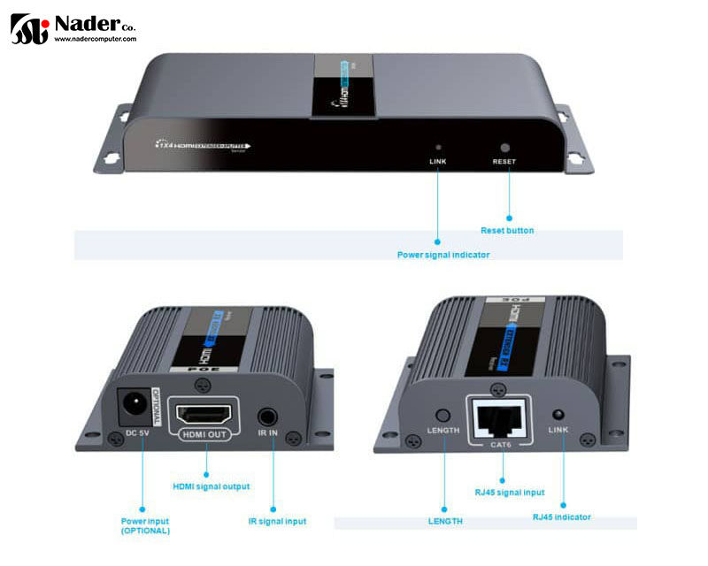 - در ابتدا متصل کردن خروجی HDMI منبع به فرستنده (TX) و ورودی HDMI هر یک از نمایشگرها به گیرندهها (RX)