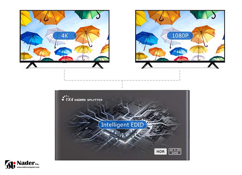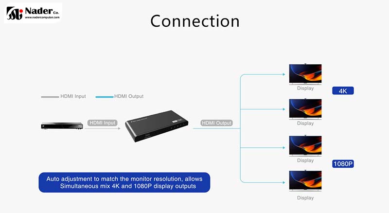 با توجه به اطلاعات EDID صفحه نمایش، به طور خودکار بهترین رزولوشن صفحه نمایش را مطابقت داده و خروجی می دهد و میتواند سیگنال های 4K و 1080P را به طور همزمان ارسال کند. این قابلیت سبب شده این اسپلیتر بسیار بینظیر جلوه کند.