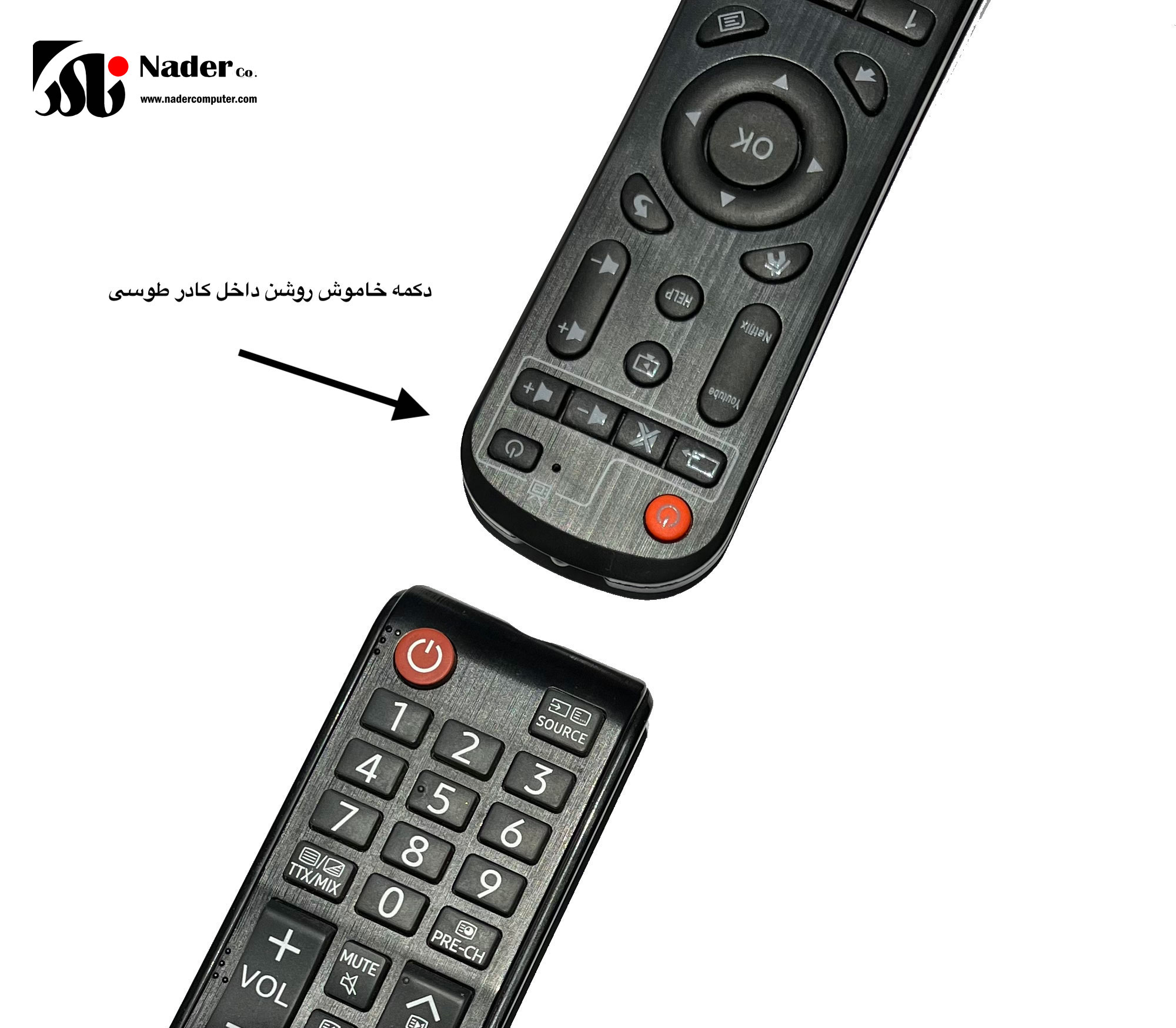 ابتدا ریموت کنترل تلویزیون و اندروید تی وی را روبروی هم قرار میدهیم بصورتیکه چشمی ریموتها روبروی هم باشند .دکمه خاموش/ روشن داخل کادر طوسی رنگ را به مدت 5 ثانیه نگه دارید تا چراغ LED  قرمز رنگ کنار آن ثابت شود . حال کلید مورد نظر جهت برنامه ریزی بر روی ریموت اندروید تی وی را فشار دهید و همزمان کلید مشابه بر روی ریموت تلویزیون را بزنید , LED قرمز رنگ شروع به چشمک زدن میکند پس از ثابت شدن آن یکی از کلیدهای خارج از کادر را بفشارید تا عملیات انجام شده ذخیره گردد .( به عنوان مثال دکمه خاموش / روشن را 5 ثانیه نگه دارید سپس همزمان دکمه صدا + روی کنترل اندروید تی وی و دکمه صدا + روی ریموت تلویزیون را بفشارید , LED  چشمک زده و سپس ثابت میگردد حال یکی از دکمه های بیرون کادر رابفشارید .با ریموت اندروید تی وی میتوانید صدای تلویزیون را زیاد کنید .)