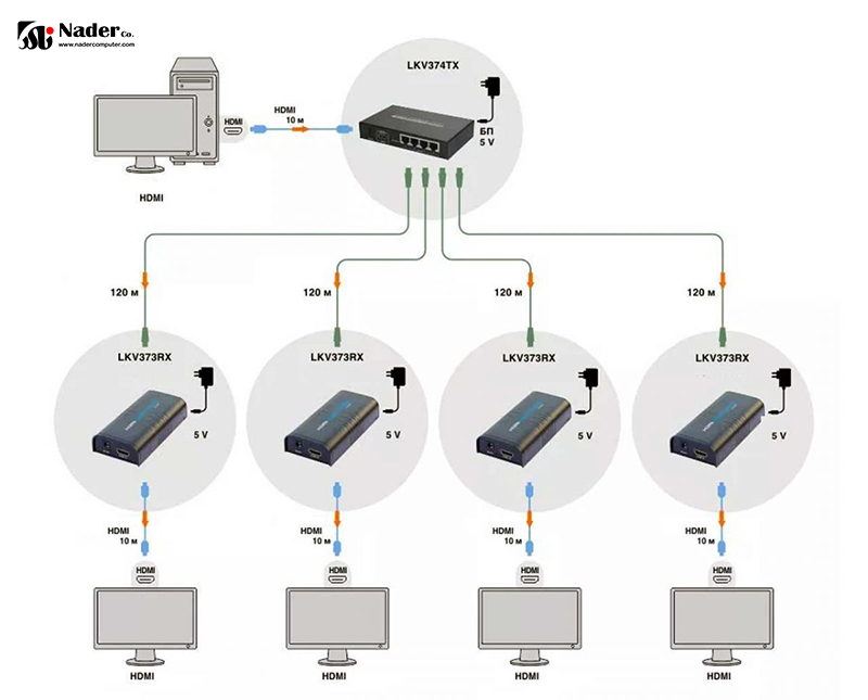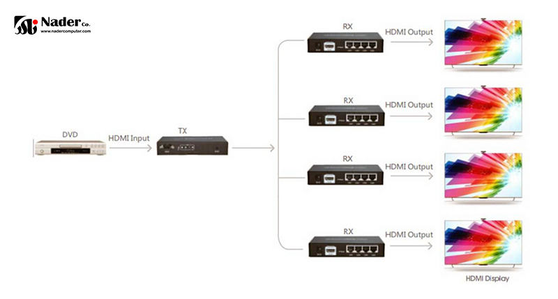 - اتصال خروجی HDMI منبع خود به فرستنده TX و ورودی HDMI نمایشگر نهایی به گیرنده RX