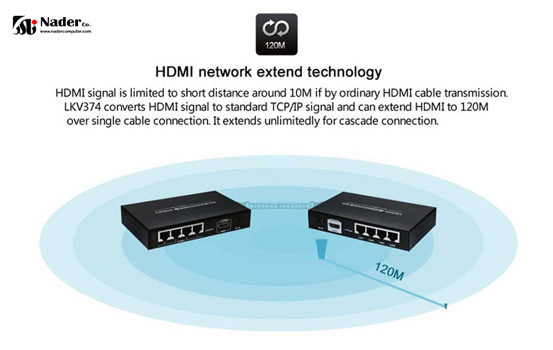 اکستندر HDMI لنکنگ مدل LKV374 روی cat5e/cat6 برای تبدیل سیگنال HDMI به TCP/IP استاندارد و انتقال از طریق کابل اینترنت یا شبکه طراحی شده است. با مزیت استاندارد TCP/IP، میتواند منبع سیگنال HDMI را از کارت نمایشگر HD، DVD، PS3، HDMI و غیره به پروژکتور HD، DLP، LCD، LED و سایر تجهیزات صوتی و تصویری منتقل کند.