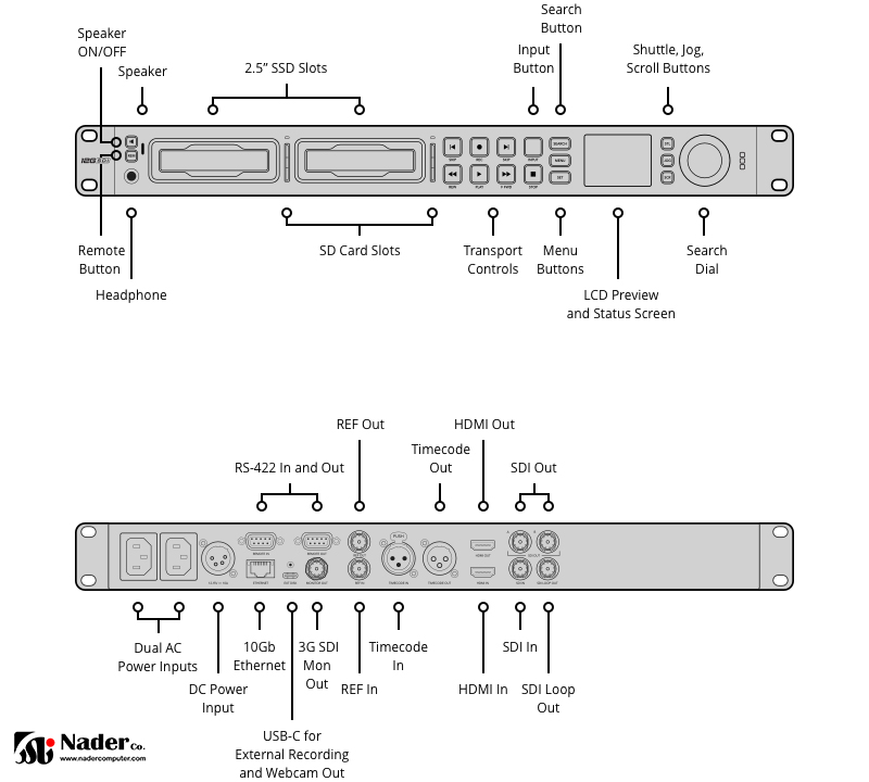 رکوردر بلک مجیک HyperDeck Studio 4K Pro یک واحد 1 RU است که از طریق گوشه‌های تعبیه شده در قفسه، روی قفسه نصب می‌شود. با کنترل پنل جلویی این رکوردر کار شما راحت‌تر خواهد شد. کنترل RS-422 برای کنترل خارجی با استفاده از پورت های ورودی و خروجی Ref پشتیبانی می شود. پورت USB Type-C به شما امکان ضبط بر روی دیسک های خارجی را می دهد و همچنین می توانید از آن برای وصل کردن رایانه به عنوان منبع برای پخش وب استریم استفاده کنید. ال سی دی موجود در پنل جلویی به شما امکان می دهد ویدیو را نظارت کنید و timecode و اطلاعات دیگر را نمایش دهید.