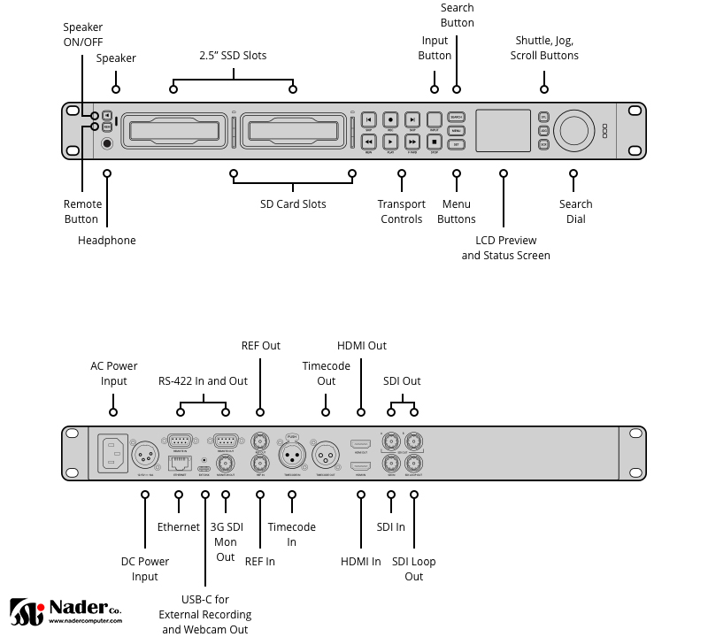 رکوردر بلک مجیک HyperDeck Studio HD Pro یک واحد 1 RU است که از طریق گوشههای تعبیه شده در قفسه، روی قفسه نصب میشود. با کنترل پنل جلویی این رکوردر کار شما راحتتر خواهد شد. کنترل RS-422 برای کنترل خارجی با استفاده از پورت های ورودی و خروجی Ref پشتیبانی می شود. پورت USB Type-C به شما امکان ضبط بر روی دیسک های خارجی را می دهد و همچنین می توانید از آن برای وصل کردن رایانه به عنوان منبع برای پخش وب استریم استفاده کنید. ال سی دی موجود در پنل جلویی به شما امکان می دهد ویدیو را نظارت کنید و timecode و اطلاعات دیگر را نمایش دهید.