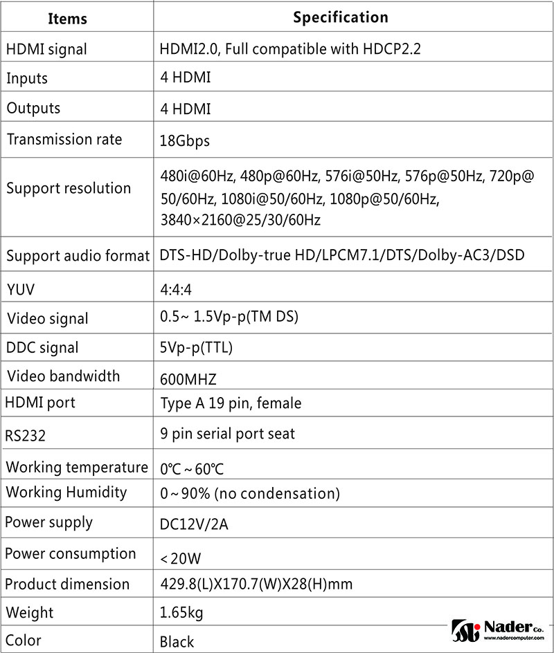 این محصول یک سوئیچ ماتریکس 4×4 HDMI2.0 است، از رزولوشن تصویر تا 4K×2K@60 هرتز، با 4 ورودی HDMI و 4 خروجی HDMI پشتیبانی می کند. 4 ورودی HDMI امکان اتصال همزمان تا 4 منبع ویدئویی با کیفیت بالا مانند سیستم های ماهواره و Blu-ray را در خود جای میدهند.