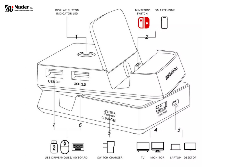 1. دکمه نمایش و LED: برای تغییر نمایش ویدیو بین تلویزیون متصل و NS فشار دهید. چراغ LED هنگام نمایش روی نمایشگر روشن است و هنگام سوییچ Nintendo خاموش میباشد.