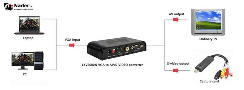 با استفاده از مبدل VGA به AV لنکنگ مدل LKV2000N، می توان صفحه نمایش کامپیوتر انتقال داده و روی صفحه نمایش بزرگتر مانند تلویزیون که ورودی VGA ندارد، مشاهده کرد. رزولوشن تصویر می تواند به اندازه تصاویر پخش شده توسط دستگاه های DVD باشد. این مبدل برای جلسات توجیهی تجاری، آموزش چند رسانه ای، پخش ویدیویی برای ارتقای فروش، بازی های رایانه ای و غیره مناسب است.