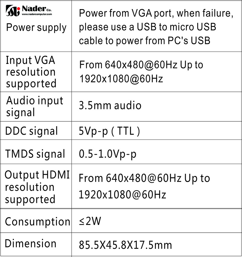 این مبدل، PC VGA و صدا را به HDMI تبدیل میکند و امکان اتصال کامپیوتر به تلویزیون HD 1080p را فراهم میکند. از رزولوشن چندگانه تا 1920x1080@60HZ پشتیبانی می کند. بدون مقیاسکننده (scaler) است، در حالی که از محبوبترین رزولوشنها برای اطمینان از سازگاری بالا پشتیبانی میکند.
