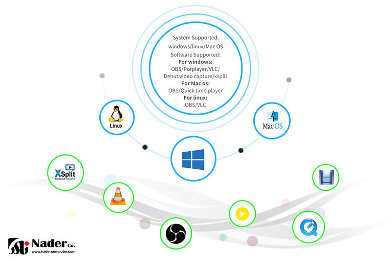 این کارت کپچر از سیستم های windows، linux و Mac OS پشتیبانی میکند. همچنین با نرم افزارهای استریم که شامل OBS، Potplayer، VLC، Debut video capture، xsplit، Quicktime player سازگاری دارد.