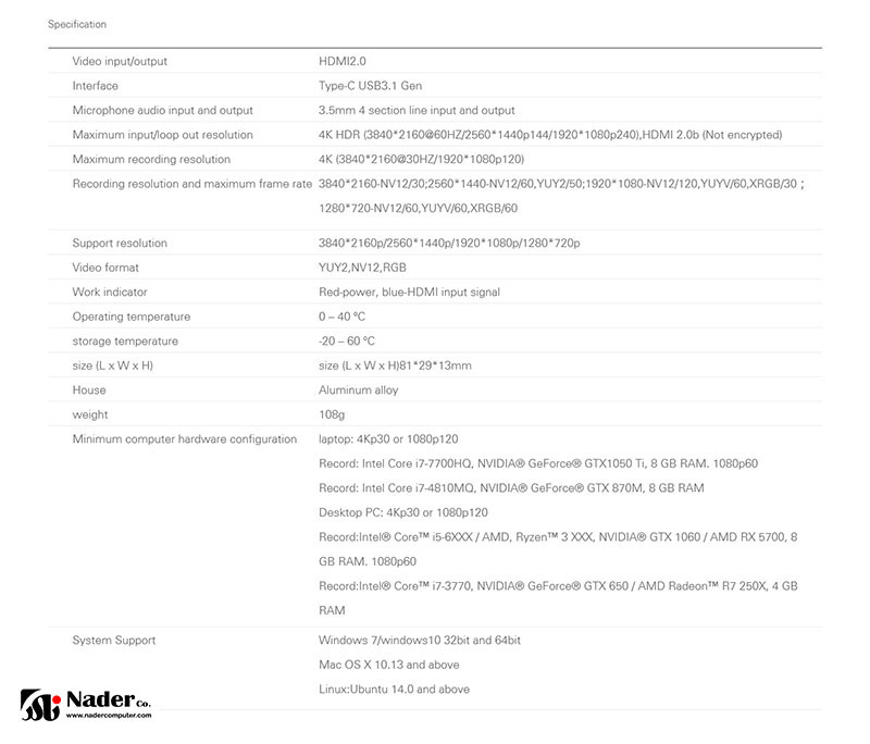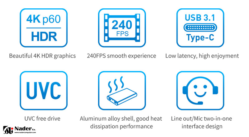 - پشتیبانی از ورودی ویدئو HDMI 4Kp60 HDR رزولوشن کپچر تا 4K@30