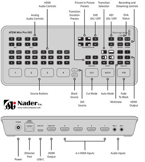 ATEM Mini Pro ISO علاوه براینکه دارای طراحی جمع جوری است دارای یک کنترل پنل جلویی بوده که امکانات بسیاری را در اختیار شما قرار میدهد؛ پنل جلویی شامل دکمه‌های آسان برای انتخاب منابع، جلوه‌های ویدیویی و انتقال است. همچنین پنل جلویی این میکسر بلک مجیک دارای دکمه‌هایی برای کنترل ضبط و پخش استریم و همچنین دکمه‌های انتخاب خروجی است که به شما امکان می‌دهند خروجی ویدیو را بین دوربین‌ها، برنامه و مولتی ویو تغییر دهید. در پنل پشتی Blackmagic ATEM Mini Pro ISO، اتصالات HDMI برای دوربین‌ها یا رایانه‌ها، ورودی‌های میکروفون اضافی، USB برای خروجی وب کم به اضافه یک خروجی HDMI "aux" برای فیلم برنامه وجود دارد.