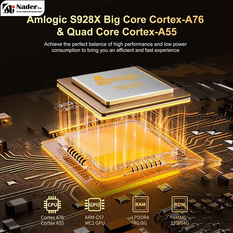 • دارای پردازشگر 5 هسته‌ای Amlogic S928 شامل یک Arm Cortex A76 و چهار Arm Cortex A55
