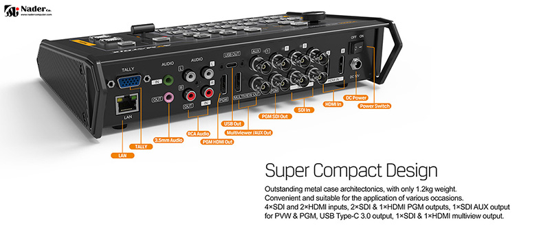 - دارای دو خروجی 3G/HD/SD-SDI و یک خروجی HDMI PGM (برنامه)، یک خروجی SDI AUX و یک خروجی HDMI و SDI Multiview