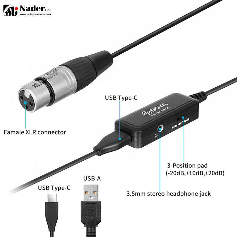 BOYA BY-BCA7 PRO دارای یک کابل میکروفون XLR با کابل اتصال لایتنینگ (MFi Lightning) برای دستگاههای iOS و کابل رابط USB-A برای رایانههای شخصی، Windows و Mac است. مبدل میکروفون بویا BOYA BY-BCA7 Pro دارای رابط USB-A است، تا بتوانید میکروفونهای XLR را به رایانه Mac و Windows متصل کنید. همچنین کابل رابط Type-C در محتوای بسته بندی مبدل میکروفون بویا BOYA BY-BCA7 Pro گنجانده شده است که برای اتصال میکروفونهای XLR به اکثر دستگاههای Type-C میباشد. مبدل میکروفون بویا BOYA BY-BCA7 Pro دارای تنظیمات 3 سوییچ (-20dB,+10dB,+20dB) بوده و حداکثر صدابرداری با نرخ 24bit/48kHz است. BOYA BY-BCA7 Pro بدون نیاز به باتری است و از دستگاهی که به آن متصل میگردد، انرژی خود را دریافت میکند.
