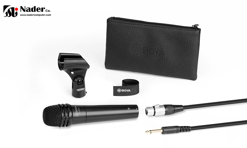 اگر نمیخواهید میکروفون دستی بویا BOYA BY-BM57 را در دست بگیرید، میتوانید آن را در نگهدارنده میکروفون ارائه شده که یک اتصال 3/8 اینچی در پایین دارد، نصب کنید. شما میتوانید براحتی از BOYA BY-BM57 در هر موقعیتی که دوست دارید، استفاده کنید. از طریق کابل 3 پین XLR، میکروفون دستی بویا BOYA BY-BM57 خود را به دستگاه مورد نظر مانند میکسر صدا یا ضبط کننده صوتی XLR متصل میکنید. از آنجایی که میکروفون دستی بویا BOYA BY-BM57 پویا (Dynamic) است، به طور منطقی نیاز به باتری را از بین میبرد. برای ایمن و حمل آسان میکروفون دستی بویا BOYA BY-BM57، یک کیف چرمی به عنوان استاندارد در بستهبندی گنجانده شده است.