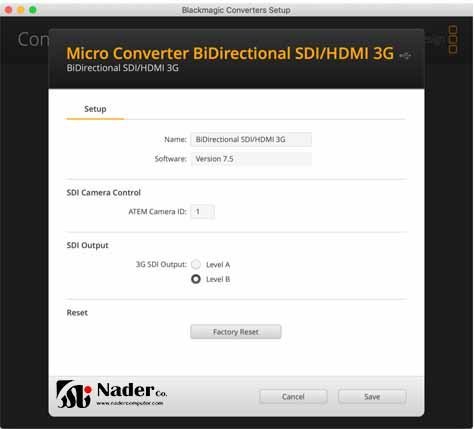 همچنین می توانید تنظیمات را تغییر داده و نرم افزار مبدل را با ابزار مبدل رایگان که از وب سایت Blackmagic Design بارگیری می شود، به روز کنید. این نرم افزار به Micro Converters به اتصال USB متصل می شود و هم در رایانه های Mac و هم در Windows اجرا می شود. می توانید از ابزار برای تغییر نام مبدل استفاده کنید که می تواند برای شناسایی اینکه کدام مبدل برای کدام کار استفاده می شود مفید باشد! هنگام استفاده از مبدل bidirectional converter، حتی می توانید شماره دوربین را تنظیم کنید بنابراین مبدل می داند چه زمانی از طریق یک سوئیچر تولید مستقیم کنترل می شود. همچنین می توانید از سطح A و B در خروجی فیلم 3G-SDI انتخاب کنید.