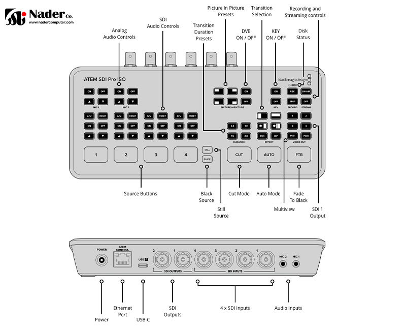 همانطور که اشاره شد میکسر بلک مجیک Blackmagic ATEM SDI Pro ISO دارای 4 پورت ورودی 3G-SDI بوده که به وسیله آن میتوانید منابع ویدیویی مانند دوربین فیلمبرداری، کامپیوتر و ... را متصل نمایید. همچنین میکسر بلک مجیک ATEM SDI Pro ISO دارای 2 پورت خروجی 3G-SDI از نوع AUX بوده که براحتی میتوانید آنها را با هدف ارسال تصویر به انواع صفحه نمایش، تنظیم نمایید. شما از طریق میکسر بلک مجیک Blackmagic ATEM SDI Pro ISO میتوانید انواع فرمتها را به رزولوشن استاندارد تبدیل کنید که از حداکثر کیفیت 1080p60 (Full HD) پشتیبانی میکند. Blackmagic ATEM SDI Pro ISO دارای کنترل پنل پیشرفته است که دارای انواع کلیدهای انتقال تصویر و افکتهای DVE میباشد. شما با اتصال میکسر بلک مجیک Blackmagic ATEM SDI Pro ISO به کامپیوتر از طریق پورت Ethernet، میتوانید از نرم افزار کنترل پنل مجازی بهره ببرید.