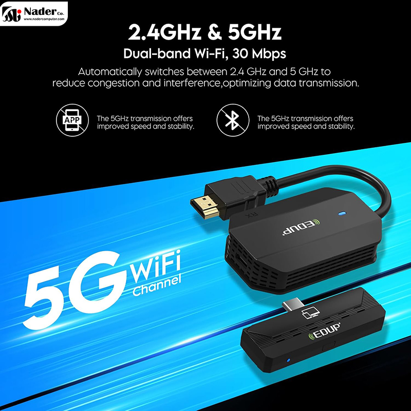 EDUP Wireless HDMI Transmitter and Receiver، تجربه‌ای نو از انتقال تصویر را تجربه کنید! دانگل بی‌سیم HDMI مدل EDUP Wireless HDMl Transmitter and Receiver با پشتیبانی از رزولوشن 4K و خروجی 1080P، تصاویر شفاف و باکیفیت را بدون نیاز به سیم‌کشی به نمایشگر منتقل می‌کند. دانگل بی‌سیم TYPE-C to HDMI مدل EDUP Wireless HDMl Transmitter and Receiver با برد چشمگیر 164 فوت (50 متر) و پشتیبانی از دو باند 2.4G و 5G، اتصال پایدار و بدون تأخیر را حتی در محیط‌های بزرگ تضمین می‌کند. طراحی Plug and Play در دانگل بی‌سیم HDMI مدل EDUP Wireless HDMl Transmitter and Receiver باعث می‌شود بدون نیاز به نصب نرم‌افزار، تنها با اتصال سریع، آماده استفاده باشد. EDUP Wireless HDMI Transmitter and Receiver همچنین با پشتیبانی از درگاه USB-C 3.1 (DP-Alt Mode)، می‌توانید گوشی هوشمند یا لپ‌تاپ خود را به آسانی به تلویزیون یا پروژکتور متصل کنید و از تماشای محتوای دلخواهتان لذت ببرید.