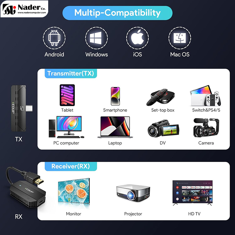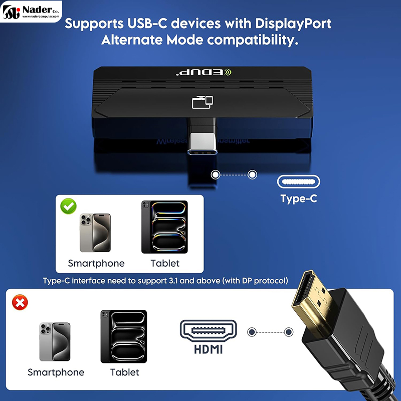 دانگل بی‌سیم HDMI مدل EDUP Wireless HDMl Transmitter and Receiver با تلفن‌های همراه ( گوشیهای با پشتیبانی از سیستم PD ) ، تبلت‌ها، لپ‌تاپ‌ها، رایانه‌های شخصی سازگار است و می‌تواند به صورت بی‌سیم از طریق خروجی TYPE-C  به اکثر نمایشگرها مانند تلویزیون و مانیتور یا ویدیو پروژکتور  متصل شود. دانگل بی‌سیم Type-C to HDMI مدل EDUP Wireless HDMl Transmitter and Receiver از لپ‌تاپ‌ها، تلویزیون‌ها، مانیتورها پشتیبانی می‌کند. توجه داشته باشید تلفن‌های همراه نسخه Type C باید از DP-Alt Mode پشتیبانی کنند.