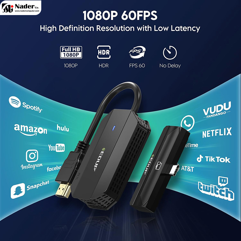 دانگل بی‌سیم Type-c to HDMI مدل EDUP Wireless HDMl Transmitter and Receiver از وضوح تصویر Full HD با تراشه رمزگشایی Ultra HD 4K داخلی پشتیبانی می‌کند و خروجی 1080P/60Hz و طیف رنگی RGB کامل را بدون فشرده‌سازی ارائه می‌دهد. دانگل بی‌سیم HDMI مدل EDUP Wireless HDMl Transmitter and Receiver برای پخش Netflix، HBO Max، Hulu و Spotify از دستگاه‌های تلفن همراه به تلویزیون بسیارایده‌آل است.