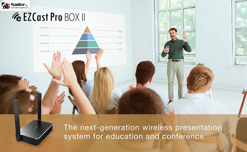 دانگل بیسیم ایزدکست EZCast Pro Box II B10 در حین ارائه بصورت بیسیم به عنوان گیرنده عمل میکند و از طریق HDMI به نمایشگر یا پروژکتور متصل میشود.