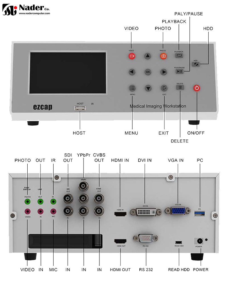 کارت کپچر و رکوردر ایزدکپ Ezcap 292P دارای یک پنل کنترل جلویی است که به گونهای طراحی شده تا استفاده از آن بسیار ساده باشد؛ حتی کاربران تازهکار میتوانند به راحتی فیلمها و تصاویر ثابت را ضبط کنند. این طراحی به گونهای است که تا حد زیادی نیاز به آموزش را کاهش میدهد. با کارت کپچر و رکوردر ایزدکپ Ezcap 292P، تجربهای آسان از فیلمبرداری خواهید داشت و با فشردن دکمهای که در تصویر نیز مشخص است، ضبط ویدئوی Full HD Surgical به سرعت آغاز میشود. مانیتور LCD 4.3 اینچی با رزولوشن بالا، دیدی واضح و گسترده ارائه میدهد و به کاربران امکان میدهد به راحتی تصاویر ضبط شده در حین جراحی یا معاینه و همچنین پس از آن برای نمایش زنده (Live View) را مشاهده و بررسی کنند. کارت کپچر و رکوردر ایزدکپ Ezcap 292P علاوه بر پنل جلویی شامل صفحه نمایش و دکمههای کاربردی، دارای پنل عقبی نیز هست که اتصالات ویدیویی و کنترلرهای دستگاه را در خود جای داده است.