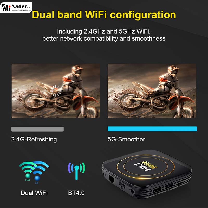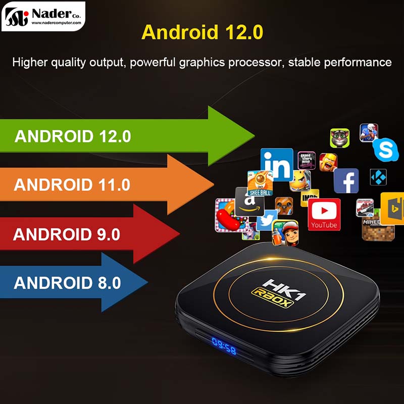 اندروید باکس HK1 RBOX H8S 4/32 Android 12.0 دارای سیستم‌ عامل Android 12.0 است که با اکثر برنامه‌های Android، برای رفع نیازهای کاربران مختلف، بازی‌ها، ویدیوها و غیره سازگاری دارد. اندروید باکس HK1 RBOX H8S 4/32 Android 12.0 تصویری با کیفیت بالا و استریم ویدیو را به شما ارائه می‌دهد. اندروید باکس HK1 RBOX H8S 4/32 Android 12.0 از فناوری شبکه بی‌سیم WiFi6 استفاده می‌کند که باعث می‌شود WiFi و اترنت 2.5GHz-5GHz شما سریع‌تر، تأخیر کمتر و پایدارتر در محیط WiFi یکسان باشد.