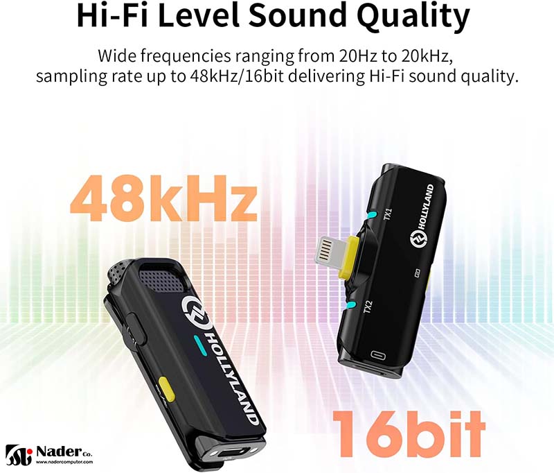 میکروفون بیسیم هالی لند Hollyland Lark C1 Solo با نرخ نمونه برداری و عمق بیت 48 کیلوهرتز و 16 بیت، صداهایی را با جزئیات فوق العاده غنی از همه جهات در فرکانسهای وسیع از 20 هرتز تا 20 کیلوهرتز ضبط میکند و کیفیت صدای Hi-Fi را ارائه میدهد. میکروفون بیسیم هالی لند Hollyland Lark C1 Solo که با الگوریتم پردازش صوتی پیشرفته طراحی شده است، صدای دیجیتالی شفاف و با کیفیت را با حذف نویزهای پس زمینه ارائه میدهد.