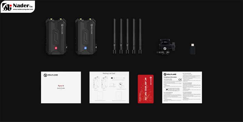 محتوای موجود در بسته بندی فرستنده و گیرنده تصویر بی‌سیم هالی لند Hollyland Pyro H 4K