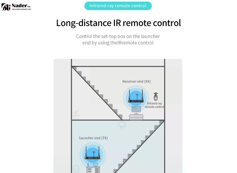 ویژگی داخلی سیگنال IR در اکستندر بیسیم میرااسکرین MiraScreen R4 Extender به شما امکان میدهد دستگاه پخش را از راه دور کنترل کنید. تصور کنید یک دستگاه پخش DVD در اتاق رسانه خود و یک تلویزیون در اتاق نشیمن خود دارید، در حالی که در اتاق نشیمن هستید، همچنان میتوانید از ریموت DVD خود برای کنترل پخش کننده DVD با عملکرد IR CONTROL EXTENSION استفاده کنید.