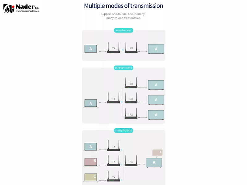 اکستندر بیسیم میرااسکرین MiraScreen R4 Extender دارای فرستنده و گیرنده HDMI بی سیم است که میتواند از 1TX تا 4RX (Max) پشتیبانی کند؛ همچنین میتوانید RX یا فرستندههای بیشتری را در صورت نیاز اضافه کنید. توجه داشته باشید با افزایش RX در اکستندر بیسیم میرااسکرین R4، فاصله انتقال به صورت بیسیم کوتاهتر میشود. از نظر تئوری، فاصله انتقال بیسیم خط دید 1 TX تا 1 RX میشود 200 متر (656 فوت). 1 TX تا 2 RX میشود 60متر (196 فوت)؛ 1 TX تا 3 RX میشود 40متر (130 فوت)؛ 1 TX تا 4 RX میشود 30متر (98 فوت).