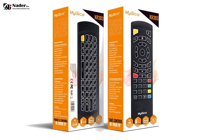 از ریموت کنترلهای جدید شرکت MyGica که به تازگی ارائه شده است، MyGica KR303 Air Mouse Voice Remote میباشد. ریموت کنترل مایجیکا توسط شرکت نادرکامپیوتر، نماینده انحصاری فروش محصولات مایجیکا در ایران، ارائه میگردد. ریموت کنترل مایجیکا MyGica KR303 Air Mouse Voice Remote ترکیبی از IR و Wireless RF است که با طراحی مناسب و ارگونومیک خود ظاهری ساده در عین حال جذاب را ارائه میدهد.