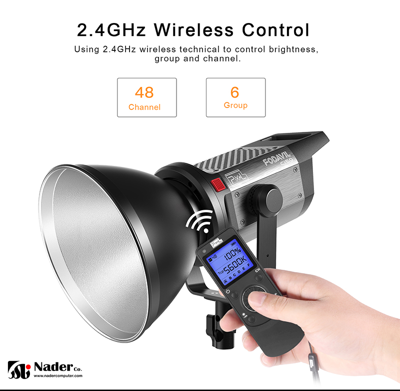 کنترل از راه دور FSK2.4 گیگاهرتز (6 گروه و 48 کانال) PIXEL COB Video Light C150، به شما امکان میدهد روشنایی نور، گروه بندی و کانال ها را از طریق کنترل از راه دور به سرعت و به راحتی تنظیم کنید. فاصله کنترل بی سیم به 164 فوت / 50 متر می رسد.