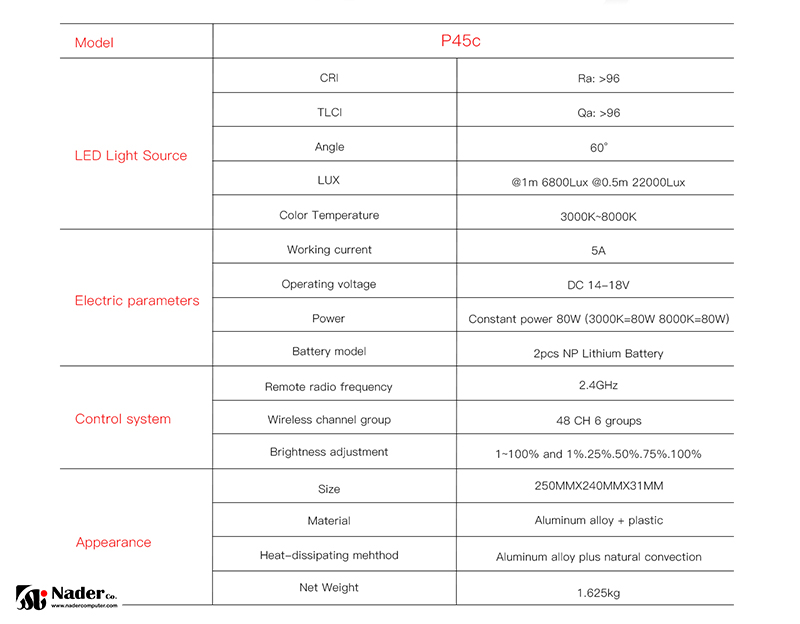 مشخصات کلی نور ثابت ال ای دی پیکسل Pixel Professional Light P45C: