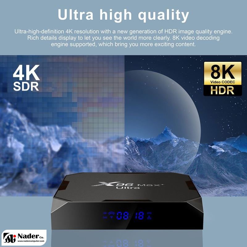 X96 Max Plus Ultra از خروجی ویدیوی 8K و 60 فریم بر ثانیه از طریق درگاه HDMI 2.1 پشتیبانی میکند که تماشای با کیفیت بالا و پخش روان ویدیو را برای شما به ارمغان میآورد و آن را به بالاترین سیگنال با وضوح موجود برای فیلمهای خانگی تبدیل میکند تا به شما امکان تماشای فیلمهای 4K را بدهد، تمام جزئیات صفحه نمایش واضح است. مشاهده ویدیو با اشباع رنگ بالا و کیفیت تصویر عالی، بدون تاخیر، نقطه قوت اندروید باکس X96 max plus ultra است. هنگام پخش برخی از نمونههای ویدیوی 4k از درایو USB در درگاه USB 3.0 از طریق پخشکننده رسانه ارائهشده، با کیفیت فوقالعاده روان و با کیفیت بالا روی 4k با سرعت 30 تا 60 فریم در ثانیه نمایش داده میشود.