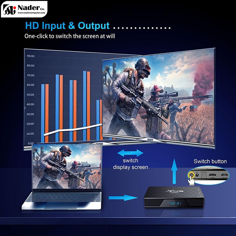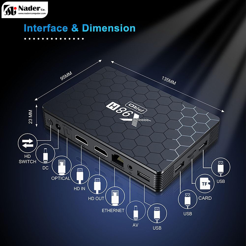 اندروید باکس مدل X98H PRO H618 4K 4/64 از رزولوشن 4K و HDR 10+ و فناوری رمزگشایی H618 پشتیبانی میکند و چشمان شما را به تصاویری الهامبخش با رنگهای عمیقتر، کنتراست بالاتر، اشباع کاملتر و تصاویر واضحتر میرساند. برای استفاده از اندروید باکس مدل X98H PRO H618 4K 4/64 فقط منبع تغذیه را متصل کنید، کابل HD و Wi-Fi/Ethernet را وصل کنید و تمام! با X98H PRO H618 4K 4/64 میتوانید از تماشای هر چیزی که دوست دارید لذت ببرید. اندروید باکس مدل X98H PRO H618 4K 4/64 دارای مزیت انتقال با سرعت بالا، با سه رابط USB است که می تواند الزامات انتقال سریع را برآورده کند.