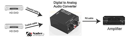 - سیگنال های صوتی دیجیتال Coaxial یا Toslink را به صدای L / R آنالوگ تبدیل می کند.