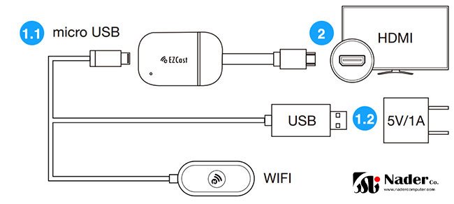 آنتن وای فای این مدل از دانگل HDMI به وسیله یک کابل که به کابل برق USB نیز وصل است، به شکل جداگانه به پورت Micro USB وصل می شود. پورت Micro USB در پشت بدنه دانگل قرار دارد. برای تامین برق دانگل ایزی کست بهتر است که از آداپتور مدل 5V 1A بهره ببرید در غیر این صورت علاوه بر اینکه دچار قطعی می شود، سرعت خوبی نیز نخواهد داشت.