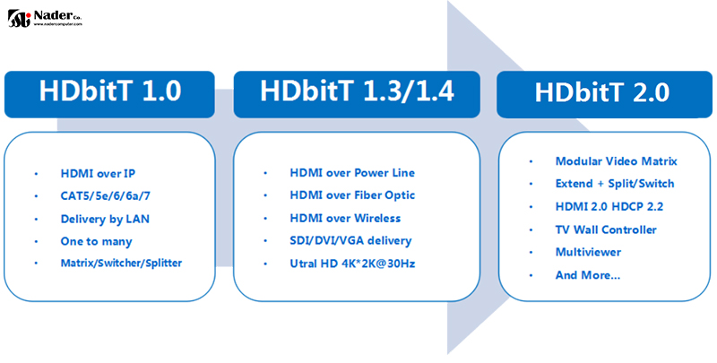®HDBitT یک فناوری برای ارائه اتصال همه جانبه است و مجموعهای از ویژگیها را ارائه میدهد که با هیچ فناوری دیگری در صنعت قابل مقایسه نیست. فناوری HDbitT پیشرفتهترین، مقرونبهصرفهترین، کارآمدترین و آسانترین راهحل همهکاره را برای توزیع همگرای ویدیوهای 4K Ultra HD، صدا، Ethernet، POE، کنترلهای مختلف (RS232، IR) و سایر سیگنالهای دیجیتال بر روی انواع مختلف انتقال ارائه میکند.