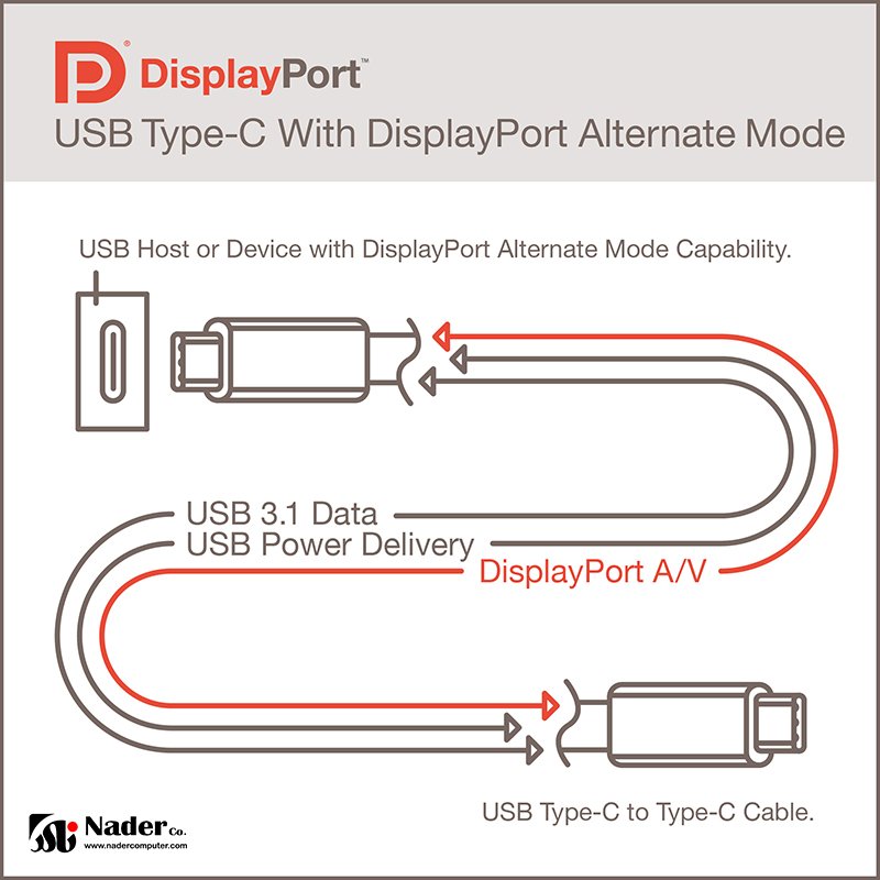 پروتکل DisplayPort، که قبلاً دارای یک کانکتور منحصر به فرد بود، در حال حاضر از طریق اتصال USB-C منتقل می شود. اتصال Type-C فناوری DisplayPort را از طریق حالت جایگزین (Alt Mode) ارائه می دهد.